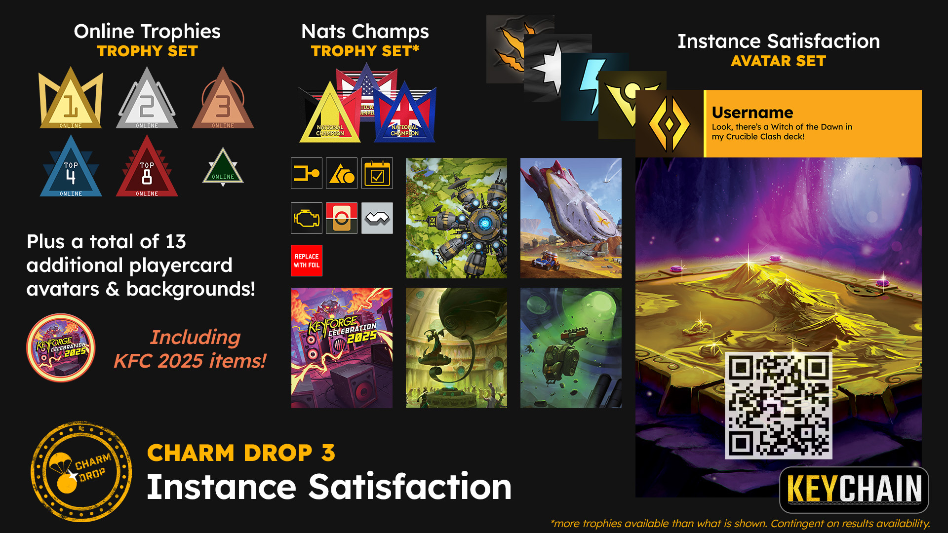 KeyChain’s first post-beta Charm Drop brings with it a suite of awards (and changes to existing ones) to support online play, as well as an assortment of other goodies to unlock, including the “Instance Satisfaction” avatar set, and some items in anticipation of KeyForge Celebration 2025.