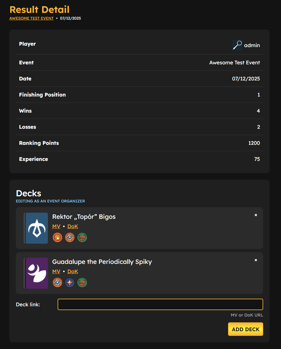 Result Decks - The KeyChain team is very excited to share that players and EOs may now attach decks to their event results!